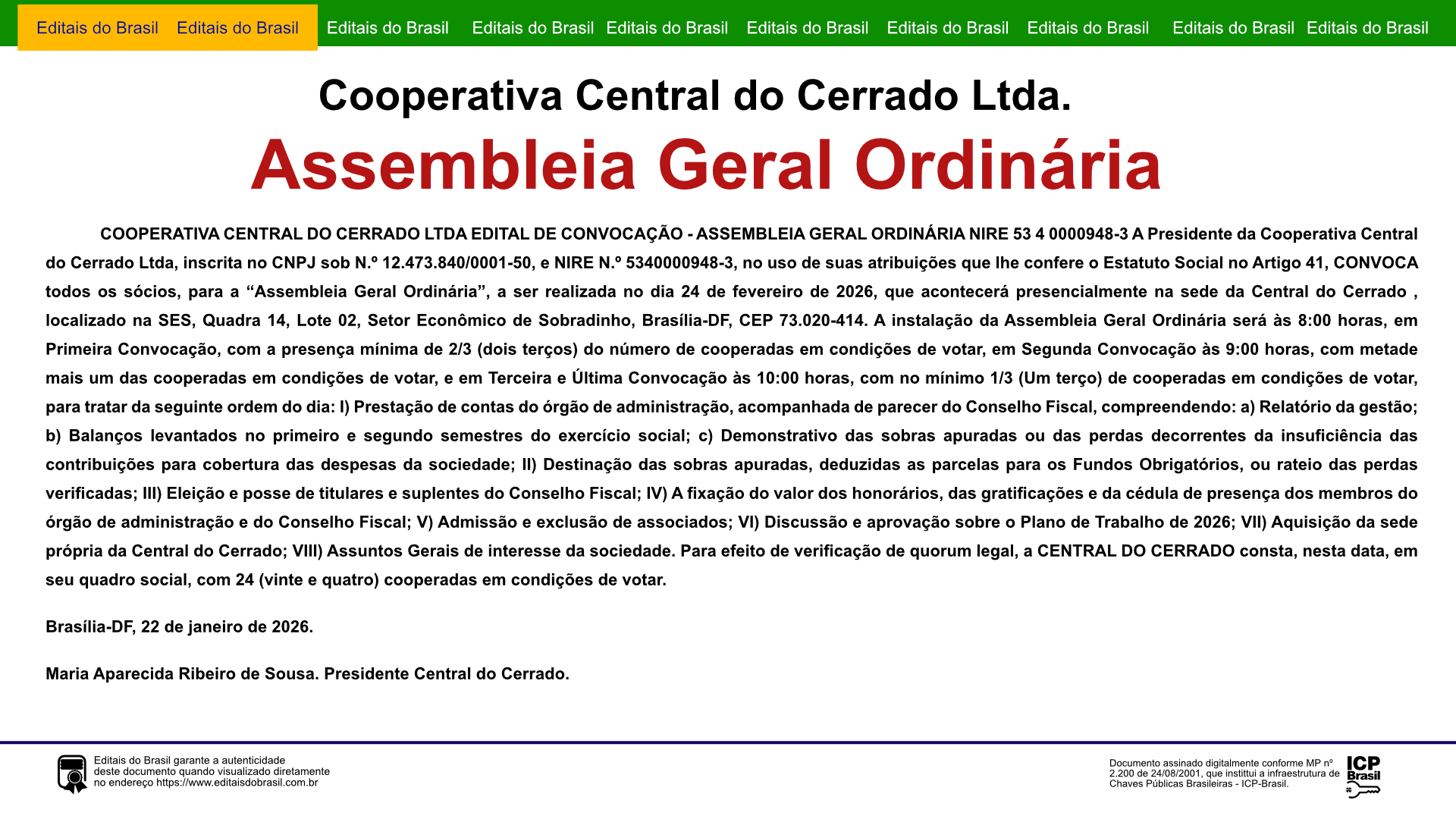 COOPERATIVA CENTRAL DO CERRADO LTDA EDITAL DE CONVOCAÇÃO – ASSEMBLEIA GERAL ORDINÁRIA NIRE 53 4 0000948-3 A Presidente da Cooperativa Central do Cerrado Ltda, inscrita no CNPJ sob N.º 12.473.840/0001-50, e NIRE N.º 5340000948-3, no uso de suas atribuições que lhe confere o Estatuto Social no Artigo 41, CONVOCA todos os sócios, para a “Assembleia Geral Ordinária”, a ser realizada no dia 24 de fevereiro de 2026, que acontecerá presencialmente na sede da Central do Cerrado , localizado na SES, Quadra 14, Lote 02, Setor Econômico de Sobradinho, Brasília-DF, CEP 73.020-414. A instalação da Assembleia Geral Ordinária será às 8:00 horas, em Primeira Convocação, com a presença mínima de 2/3 (dois terços) do número de cooperadas em condições de votar, em Segunda Convocação às 9:00 horas, com metade mais um das cooperadas em condições de votar, e em Terceira e Última Convocação às 10:00 horas, com no mínimo 1/3 (Um terço) de cooperadas em condições de votar, para tratar da seguinte ordem do dia: I) Prestação de contas do órgão de administração, acompanhada de parecer do Conselho Fiscal, compreendendo: a) Relatório da gestão; b) Balanços levantados no primeiro e segundo semestres do exercício social; c) Demonstrativo das sobras apuradas ou das perdas decorrentes da insuficiência das contribuições para cobertura das despesas da sociedade; II) Destinação das sobras apuradas, deduzidas as parcelas para os Fundos Obrigatórios, ou rateio das perdas verificadas; III) Eleição e posse de titulares e suplentes do Conselho Fiscal; IV) A fixação do valor dos honorários, das gratificações e da cédula de presença dos membros do órgão de administração e do Conselho Fiscal; V) Admissão e exclusão de associados; VI) Discussão e aprovação sobre o Plano de Trabalho de 2026; VII) Aquisição da sede própria da Central do Cerrado; VIII) Assuntos Gerais de interesse da sociedade. Para efeito de verificação de quorum legal, a CENTRAL DO CERRADO consta, nesta data, em seu quadro social, com 24 (vinte e quatro) cooperadas em condições de votar.