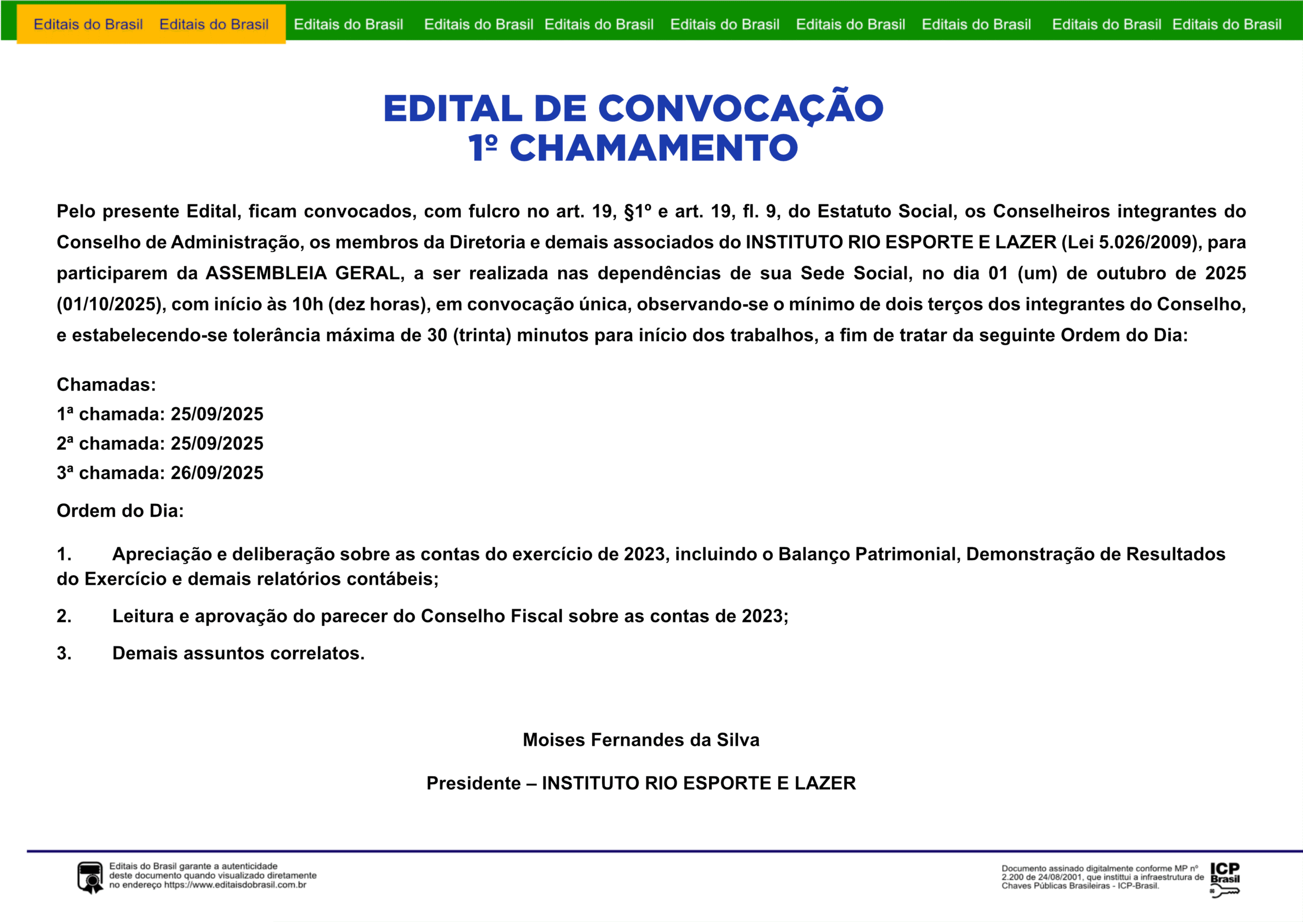 Pelo presente Edital, ficam convocados, com fulcro no art. 19, §1º e art. 19, fl. 9, do Estatuto Social, os Conselheiros integrantes do Conselho de Administração, os membros da Diretoria e demais associados do INSTITUTO RIO ESPORTE E LAZER (Lei 5.026/2009), para participarem da ASSEMBLEIA GERAL, a ser realizada nas dependências de sua Sede Social, no dia 01 (um) de outubro de 2025 (01/10/2025), com início às 10h (dez horas), em convocação única, observando-se o mínimo de dois terços dos integrantes do Conselho, e estabelecendo-se tolerância máxima de 30 (trinta) minutos para início dos trabalhos, a fim de tratar da seguinte Ordem do Dia: