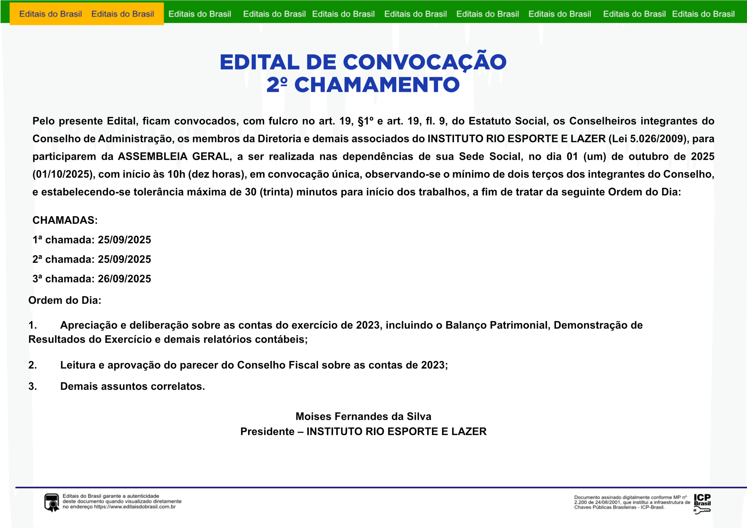 Pelo presente Edital, ficam convocados, com fulcro no art. 19, §1º e art. 19, fl. 9, do Estatuto Social, os Conselheiros integrantes do Conselho de Administração, os membros da Diretoria e demais associados do INSTITUTO RIO ESPORTE E LAZER (Lei 5.026/2009), para participarem da ASSEMBLEIA GERAL, a ser realizada nas dependências de sua Sede Social, no dia 01 (um) de outubro de 2025 (01/10/2025), com início às 10h (dez horas), em convocação única, observando-se o mínimo de dois terços dos integrantes do Conselho, e estabelecendo-se tolerância máxima de 30 (trinta) minutos para início dos trabalhos, a fim de tratar da seguinte Ordem do Dia: