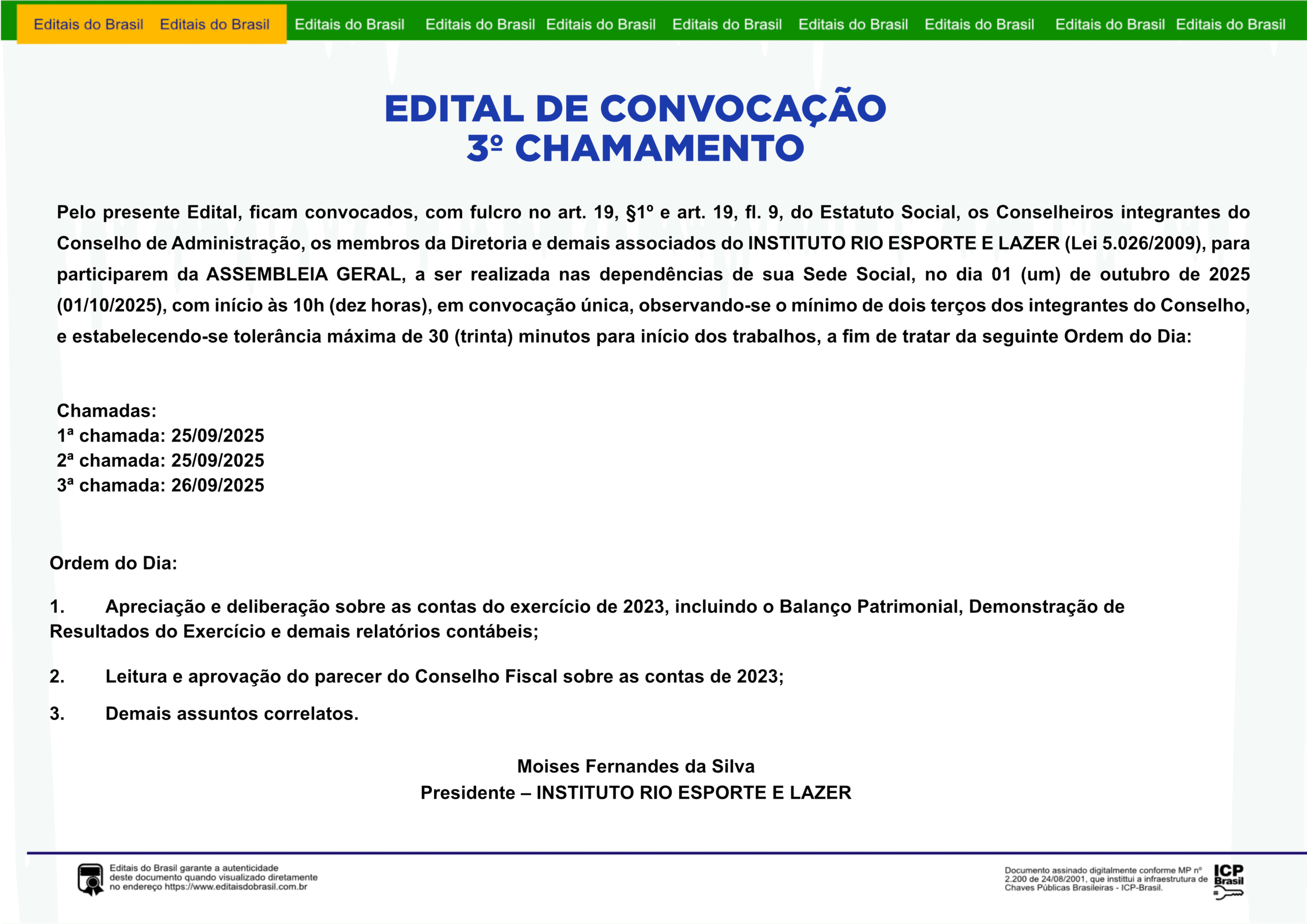 Pelo presente Edital, ficam convocados, com fulcro no art. 19, §1º e art. 19, fl. 9, do Estatuto Social, os Conselheiros integrantes do Conselho de Administração, os membros da Diretoria e demais associados do INSTITUTO RIO ESPORTE E LAZER (Lei 5.026/2009), para participarem da ASSEMBLEIA GERAL, a ser realizada nas dependências de sua Sede Social, no dia 01 (um) de outubro de 2025 (01/10/2025), com início às 10h (dez horas), em convocação única, observando-se o mínimo de dois terços dos integrantes do Conselho, e estabelecendo-se tolerância máxima de 30 (trinta) minutos para início dos trabalhos, a fim de tratar da seguinte Ordem do Dia: