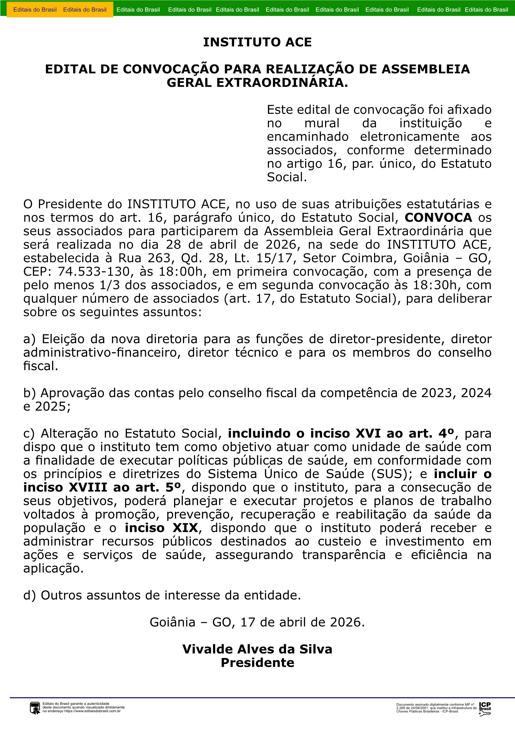 O Presidente do INSTITUTO ACE, no uso de suas atribuições estatutárias e nos termos do art. 16, parágrafo único, do Estatuto Social, CONVOCA os seus associados para participarem da Assembleia Geral Extraordinária que será realizada no dia 28 de abril de 2026, na sede do INSTITUTO ACE, estabelecida à Rua 263, Qd. 28, Lt. 15/17, Setor Coimbra, Goiânia – GO, CEP: 74.533-130, às 18:00h, em primeira convocação, com a presença de pelo menos 1/3 dos associados, e em segunda convocação às 18:30h, com qualquer número de associados (art. 17, do Estatuto Social), para deliberar sobre os seguintes assuntos: